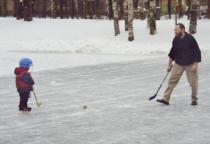 А все-таки, где лучше учиться: на катке с тренером или около дома с мамой?? Отвечаю: около дома с папой! Когда ребенок будет уже активно кататься, ему , конечно же, крайне важно видеть перед собой образец для подражания- он должен видеть, как катится мастер, но важность дикой дворовой школы недооценивать нельзя. В большинстве спортшкол занятия для маленьких хоккеистов все-таки скучны и утомительны, а двор не утомляет, двор- это праздник. Во дворе ребенок выдерживает2-3 часовую игру и его не загнать домой! Какой тренер, какого ЦСКА может похвастаться таким желанием своих подопечных?!)